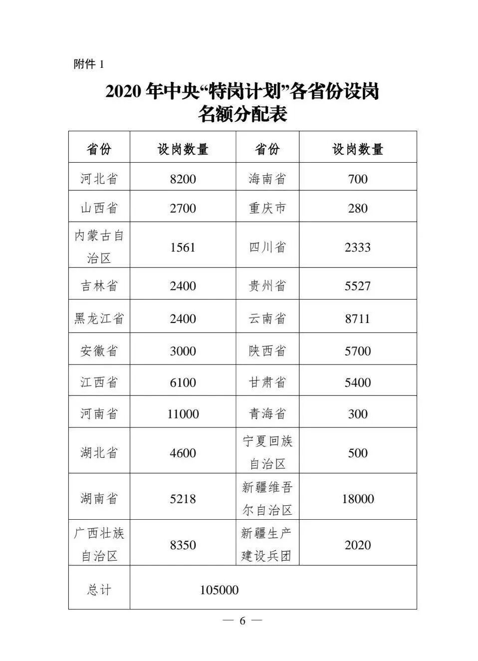 (二)招聘数量。2020年全国计划招聘特岗教师10.5万名,各省(区、市)和新疆生产建设兵团的招聘名额见《2020年中央“特岗计划”各省份设岗名额分配表》(附件1)。
