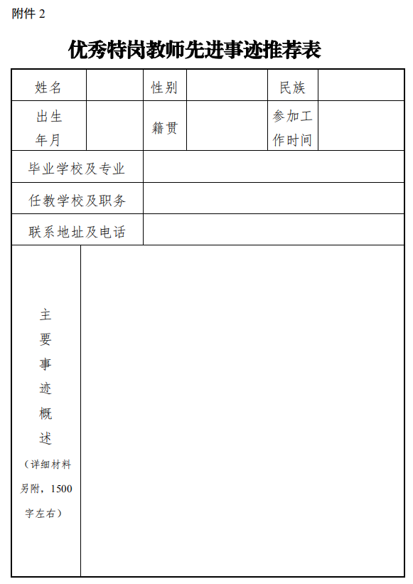 (七)营造良好社会氛围。2020年是“特岗计划”实施15周年,各地要深入挖掘特岗教师中的优秀典型,加强对“特岗计划”在提升农村义务教育质量,助力脱贫攻坚作用发挥和取得成果等方面的总结,并通过多种形式和渠道进行广泛宣传。请各地认真遴选3—5名具有代表性的优秀特岗教师和3—5个“特岗计划”组织实施较好、特岗教师群体助力农村义务教育、脱贫攻坚等作用发挥较好的典型案例,分别填写《优秀特岗教师先进事迹推荐表》(附件2)和《特岗计划组织实施典型案例推荐表》(附件3)。
