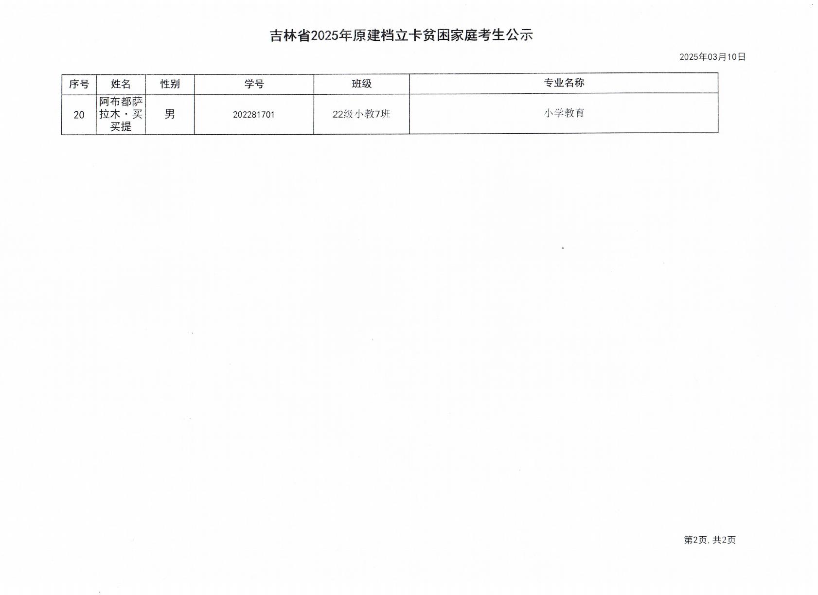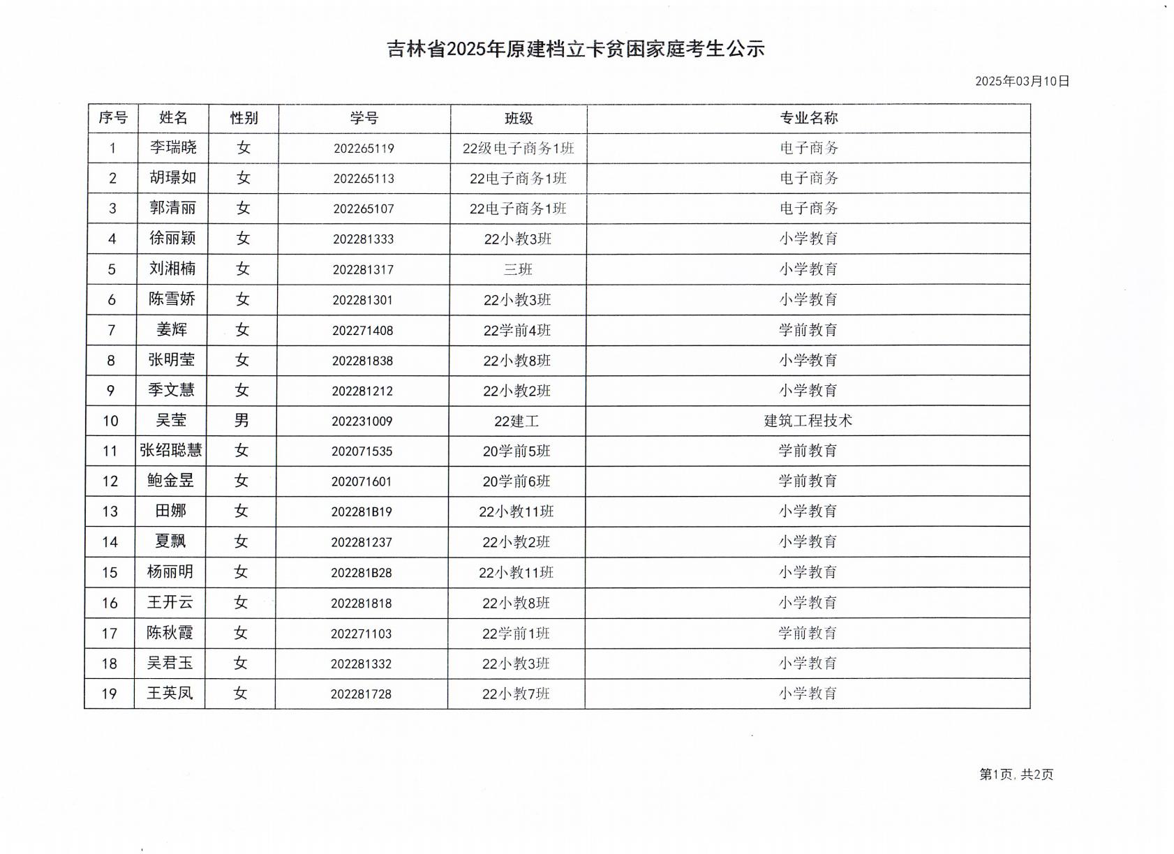 根据吉林省教育考试院《关于做好吉林省2025年普通高等学校专升本考试招生工作的通知》(吉教考〔2025〕7号)有关规定,经学生本人申请,学院资助中心审核,拟确认李瑞晓等20名同学为吉林省2025年原建档立卡贫困家庭考生,现予以公示。