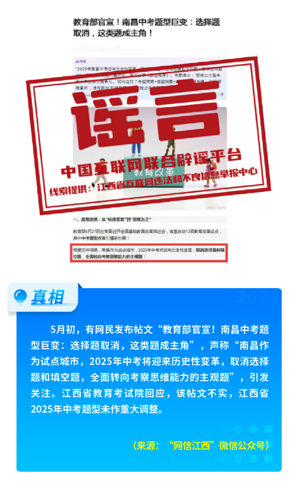谣言1 江西南昌2025年中考取消选择题和填空题?