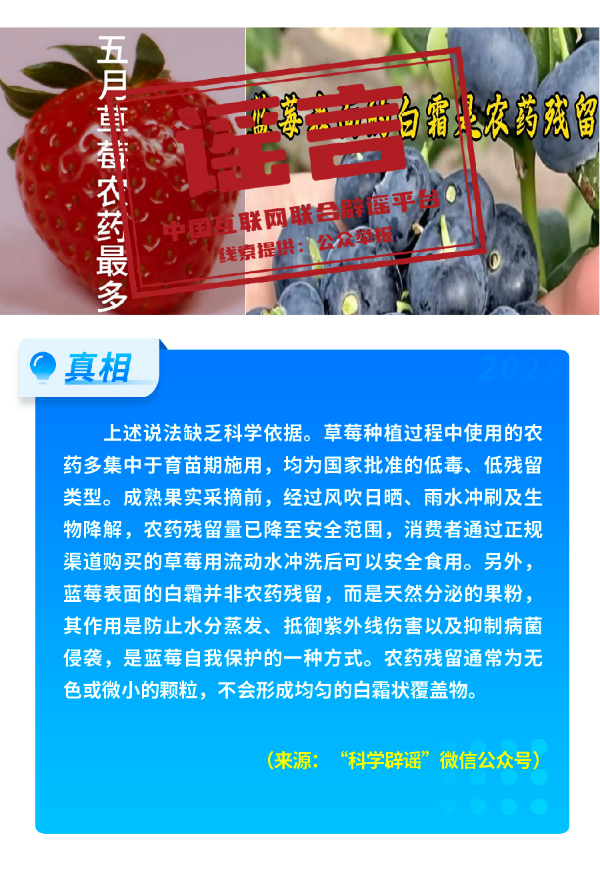 谣言3 5月的草莓农药最多,不能吃?蓝莓表面的白霜是农药残留?