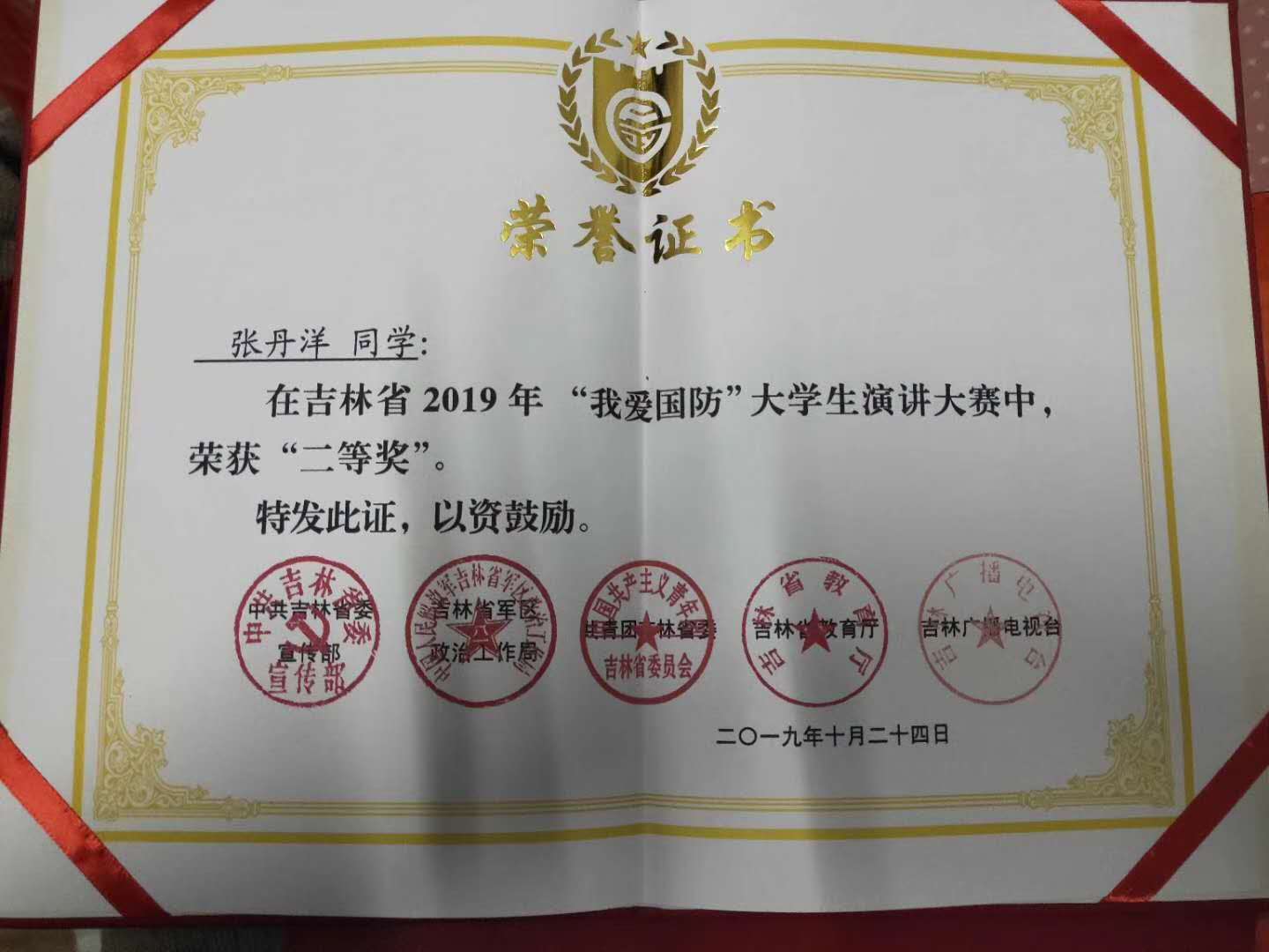 我系2017级学前教育专业(3+2)5班张丹洋同学在辅导员赵艳红老师的指导下,荣获吉林省2019年“我爱国防”大学生演讲大赛二等奖。