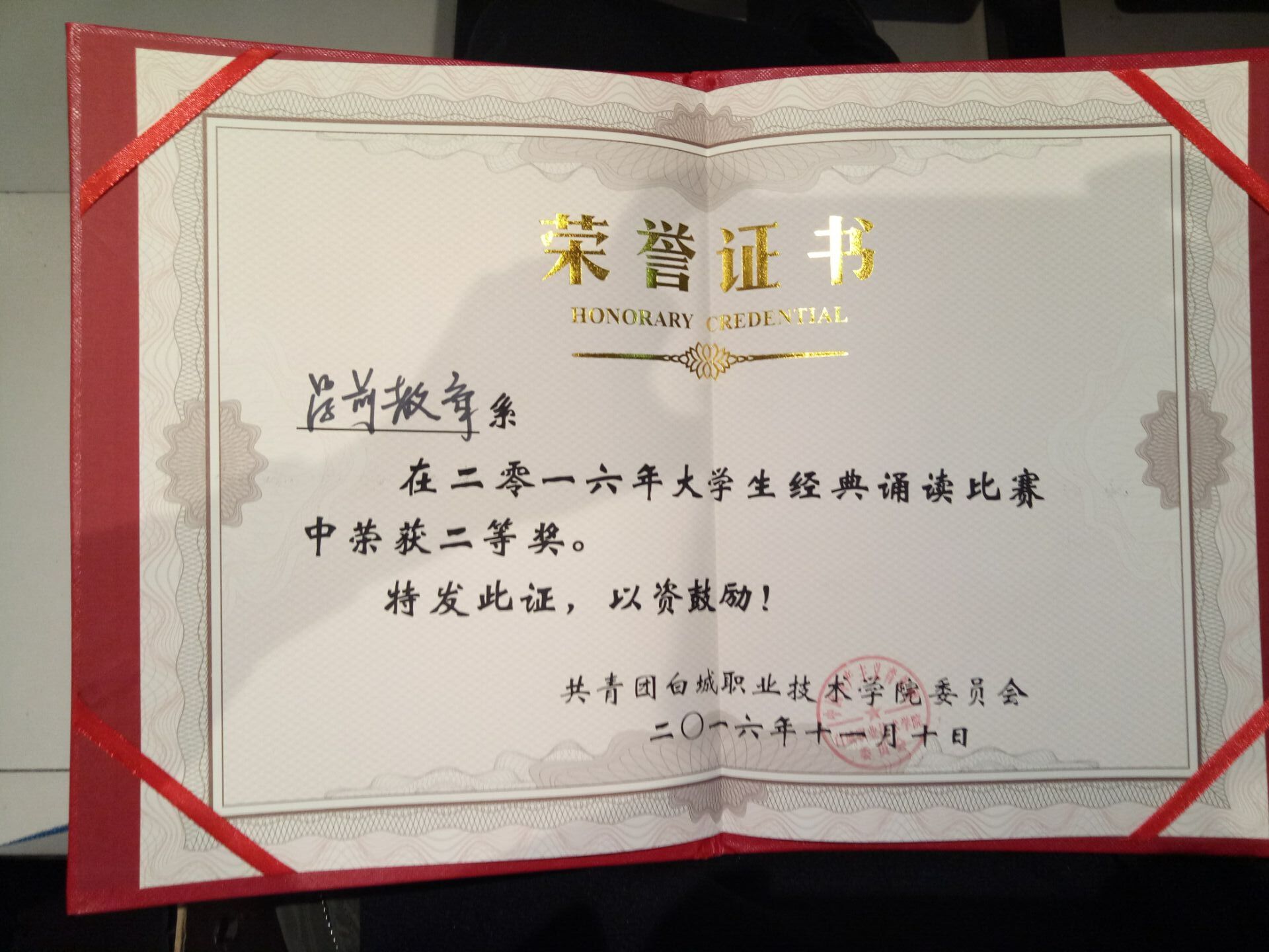 在我院团委举办的2016年经典诵读比赛中,我系荣获团体二等奖。