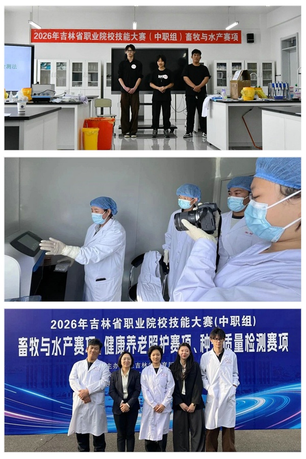 近日,在2026年吉林省职业院校技能大赛(中职组)畜牧与水产赛项中,畜牧兽医学院参赛师生奋勇拼搏、表现突出,斩获一等奖、二等奖、三等奖各1项,成绩喜人。