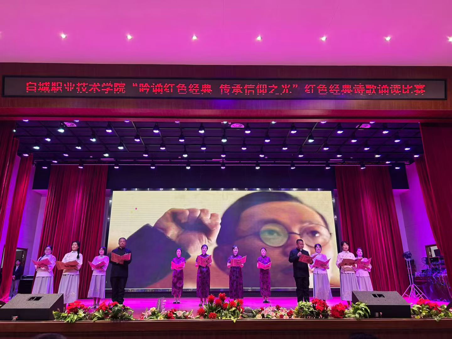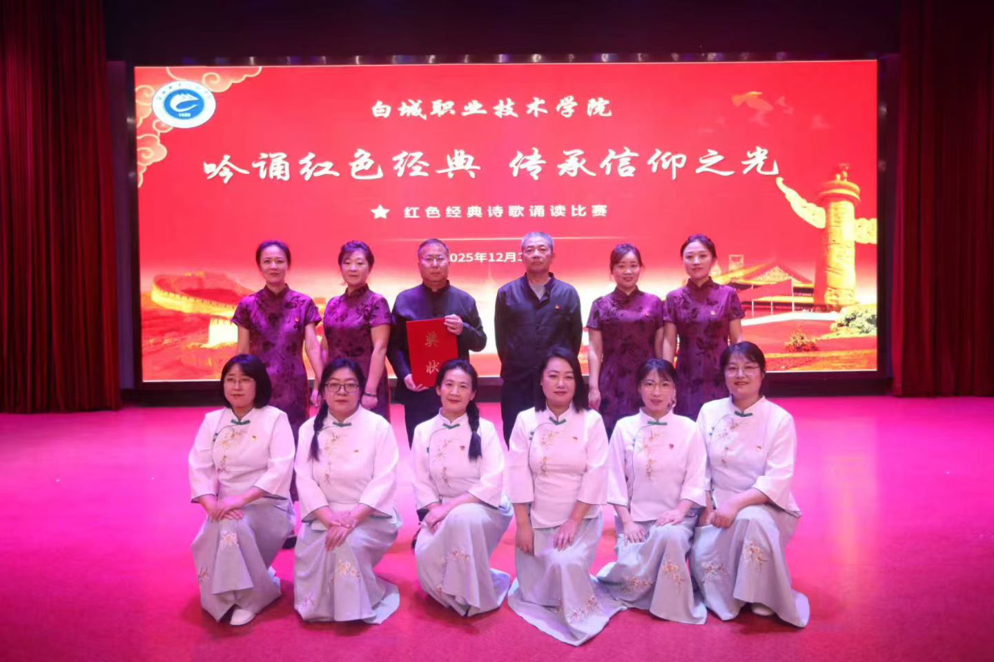 第十一党支部高度重视此次赛事,参赛党员教师充分利用课余时间刻苦排练。从篇目编排、诗稿打磨到诵读技巧、情感表达,再到站位安排、服装搭配、舞台呈现,每一个环节力争做到精益求精。比赛现场,他们用富有感染力的语言、真挚深沉的情感,重温红色岁月,展望未来华章。当《义勇军进行曲》奏响的那一刻,整体氛围推向了新高潮,深深打动了现场评委与所有观众,赢得热烈掌声。